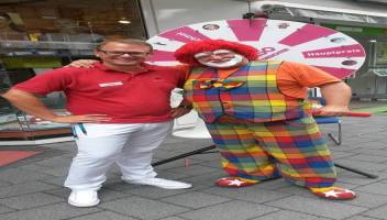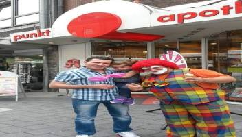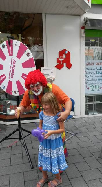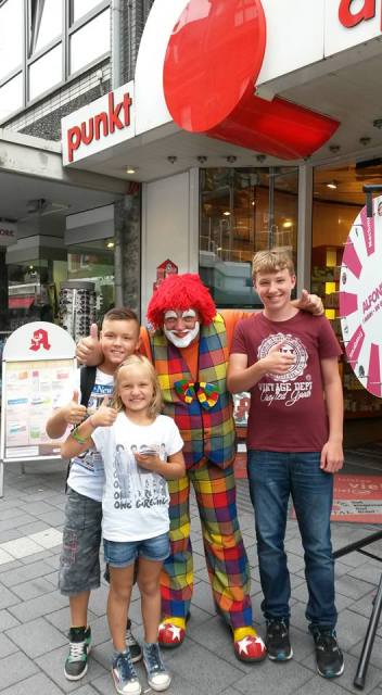 Clown Alfonso, heute am 15.8.15 vor der Punkt Apotheke in Gladbeck. Dein Glücksrad war im Einsatz und er machte den Kindern wieder Modelierluftballons und die Erwachsenen freuten sich über die vielen tollen Gewinne, die Herr Beck von der Punkt Apotheke gerne überreichte. Ein großes Dankeschön an das gesamte Team der Punkt Apotheke.